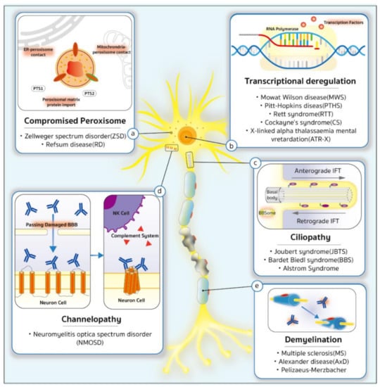 | Channelopathy | NMOSD | periependymal lesions (75%) [235] central vomiting (65.38%) central hiccups (50.00%) pyramidal tract sign (42.31%) [236] LETM (32.9%) brainstem symptoms (4.5%) [237] | ON (22.4%) [238] ophthalmoplegia (19.23%) MLF syndrome (11.54%) [239] |