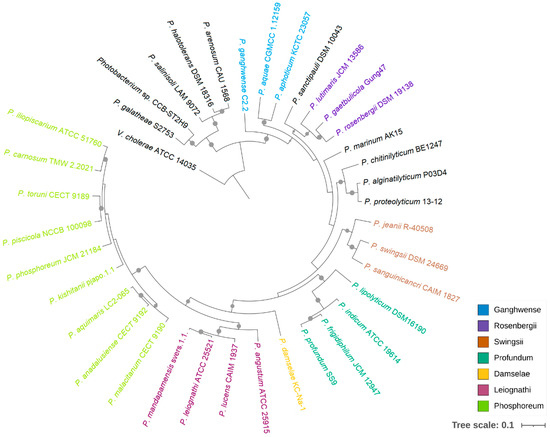 Although 16S rRNA phylogeny has been widely applied in species classification, the limitations of using this gene as a phylogenetic marker in Vibrionaceae have been noted previously [10,11]. Meanwhile, multigene phylogenies provide better resolution between phylogenetically close strains, and the tree topology is less affected by recombination events [32,33]. In this study, a phylogenomic analysis was performed based on the bacterial core genes from 37 Photobacterium strains, using Vibrio cholerae ATCC 14035 as an outgroup (Figure 1). This tree showed that CCB-ST2H9 clustered with P. galatheae S2753, forming a distinct clade with P. halotolerans DSM18316, P. salinisoli LAM9071, and P. arenosum CAU 1568, distant from the other Photobacterium strains. This grouping appears to be related to environmental sources. With the exception of P. arenosum from marine sediment, this clade consists of Photobacterium isolated from non-marine habitats: CCB-ST2H9 from estuarine sediment, P. halotolerans from a saline lake, and P. salinisoli from saline soil [7,34]. The remaining Photobacterium strains were grouped into the clades Damselae, Leiognathi, Ganghwense, Profundum, Phosphoreum, and Rosenbergii, consistent with prior reports [35,36]. While this clade classification can facilitate the study of large genera by grouping together lines of descent, it is not a standard in nomenclature [8].