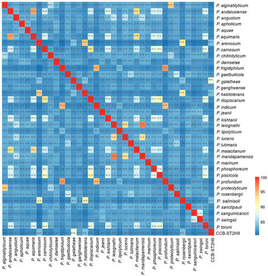 The genome evolutionary relatedness between Photobacterium strains was depicted based on the average nucleotide identity (ANI) and digital DNA–DNA hybridization (dDDH). In agreement with phylogenomic clustering, the highest ANI was shared between CCB-ST2H9 and P. galatheae (88.95%), P. halotolerans (84.26%), P. arenosum (84.25%), and P. salinisoli (84.25%) (Figure 2). Accordingly, the highest dDDH percentage (32.7%) was between CCB-ST2H9 and P. galatheae (Table S5). Both the sharing ANI and dDDH values between CCB-ST2H9 and other Photobacterium strains were below the proposed 95–96% and 70% cut-off of bacterial species definition [37,38]. Considering the 16S rRNA sequence similarity and ANI and dDDH results, strain CCB-ST2H9 is potentially a new species of the genus Photobacterium.
