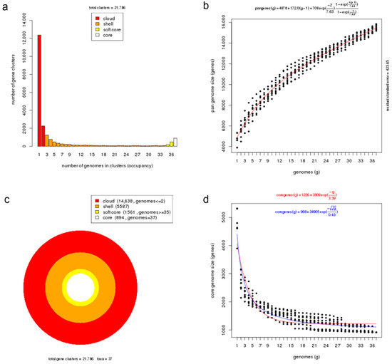 Core and pan-genome analyses of Photobacterium genus. (a) Barplot of the pan-genome matrix. (b) Plot of the estimated pan-genome size with Tellelin fit. (c) Cloud, shell, soft-core, and core clusters of the pan-genome. (d) Plot of the estimated core genome size with Tellelin and Willenbrock fit.