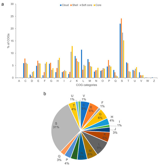 (a) Distribution of COG functional categories for cloud, shell, soft core, and core Photobacterium pan-genome clusters. (b) COG functional classification of strain CCB-ST2H9 specific genes. A: RNA processing and modification, C: energy production and conversion, D: cell cycle control and mitosis, E: amino acid metabolism and transport, F: nucleotide metabolism and transport, G: carbohydrate metabolism and transport, H: coenzyme metabolism, I: lipid metabolism, J: translation, K: transcription, L: replication and repair, M: cell wall/membrane/envelop biogenesis, N: cell motility, O: post-translational modification, protein turnover, chaperone functions, P: inorganic ion transport and metabolism, Q: secondary structure, S: function unknown, T: signal transduction, U: intracellular trafficking and secretion, V: defense mechanisms, W: extracellular structures, and Z: cytoskeleton.