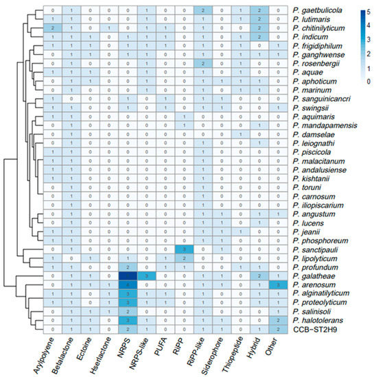 To examine the potential of Photobacterium strains to produce bioactive metabolites, the genomes were screened for the presence of biosynthetic gene clusters (BGCs) using antiSMASH software. A total of 238 BGCs were detected amongst the 37 genomes, with beta-lactone (35), ribosomally synthesized and post-translationally modified peptide (RiPP)-like (33), and non-ribosomal peptide synthetase (NRPS) (30) being the most prevalent (Figure 5). Some BGCs co-localized as hybrid clusters, such as NRPS/trans-amino transferase polyketide synthase (transAT-PKS), NRPS/type I polyketide synthase (T1PKS), aryl polyene/ectoine, and NRPS/NRPS-like/T1PKS (Table S6). Ten BGCs were identified in Photobacterium sp. CCB-ST2H9, including clusters potentially encoding beta-lactone, butyrolactone, cyanobactin, ectoine, NRPS, NRPS-like, NRPS/NRPS-like, RiPP-like, and siderophore (Table 2).