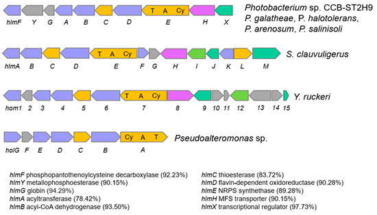 Another NRPS with potential biosynthetic novelty shows low homology (38%) with the holomycin gene cluster in Streptomyces clavuligerus ATCC 27064. Holomycin production has been reported in both P. galatheae and P. halotolerans and examined in terms of the biosynthetic gene cluster and physiological role [16,49,50]. Holomycin is a member of the dithiolopyrrolone class that displays antibiotic activity against a broad spectrum of bacteria and inhibits RNA synthesis [51,52]. Further sequence analysis revealed that the CCB-ST2H9 holomycin BGC contains 10 genes homologous to and arranged in the same manner as those in P. galatheae [49]. The cluster is formed by phosphopantothenoylcysteine decarboxylase, HlmF, metallophosphoesterase, HlmY, globin, HlmG, N-acyltransferase, HlmA, acyl-CoA dehydrogenase, HlmB, thioesterase, HlmC, flavin mononucleotide-dependent oxidoreductase, HlmD, MFS transporter, HlmH, transcriptional regulator, HlmX, and core protein NRPS synthetase, HlmE with a characteristic arrangement of cyclization (Cy), adenylation (A), and thiolation (T) domains (Figure 6). The largest block of conserved genes corresponding to hlmA-hlmE is conserved in all holomycin producers, including S. clauvuligerus, Y. ruckeri, Pseudoalteromonas sp., and Photobacterium [49,53,54,55]. The holomycin BGC was also found in the P. arenosum and P. salinosoli genomes, even though antibiotic production and antagonism in these species have not been investigated. The presence of nearly identical holomycin BGCs in P. galatheae, P. halotolerans, P. arenosum, P. salinisoli, and CCB-ST2H9 suggests that this cluster may have originated via a horizontal gene transfer (HGT) event from a donor closely related to these species. Overall, the annotation of CCB-ST2H9 genes involved in the biosynthesis of compounds with antibacterial and iron scavenging functions is in agreement with the strain’s ability to antagonize the growth of pathogenic bacteria.