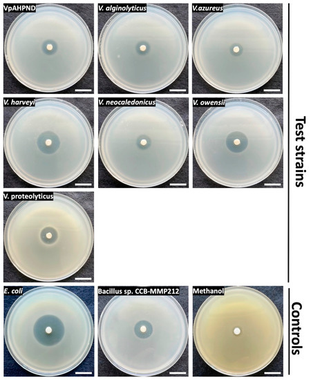Disk diffusion assay of EtOAc extract on seven Vibrio species and control strains. Scale bars indicate 2 cm.