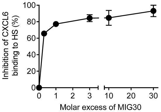 In addition to receptor binding, chemokine activity largely depends on interactions with GAGs such as heparan sulfate (HS) []. Previous work from our group showed that the MIG30 peptide (CXCL9(74-103)) is a powerful competitor of chemokine binding to GAGs, inhibiting binding of CXCL1, CXCL8, CXCL11 and CCL2 to HS []. Here, we tested the ability of MIG30 to inhibit binding of CXCL6, the most powerful neutrophil chemoattractant chemokine [,], to HS using GAG binding plates in an ELISA-like assay (Figure 1). More than half of the 30 amino acids in MIG30 are positively charged (mainly Lys), and the peptide contains multiple GAG-binding motifs, making it avid to negatively charged GAGs as HS. As expected, MIG30 competed strongly with CXCL6 for binding to HS. Interestingly, even at the lowest molar ratio (1:2), the peptide inhibited more than 60% of CXCL6 binding to HS. When the molar concentration of MIG30 exceeded the concentration of CXCL6 by a factor more than 10, CXCL6 binding was almost completely abolished (Figure 1). In summary, MIG30 inhibits the binding of multiple CXC chemokines to HS, including CXCL6, which may contribute to its anti-inflammatory role in vivo.