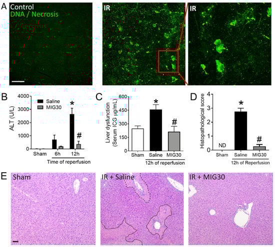 Treatment with MIG30 protects mice from liver ischemia-reperfusion injury (IRI). (A) Confocal intravital microscopy of the liver of mice subjected to sham (control) or 8 h of ischemia-reperfusion (IR) injury. Extracellular DNA and injured areas were stained by Sytox green injected intravenously. (B) Serum alanine aminotransferase (ALT) levels of mice subjected to different times of IR injury. IR mice were treated i.v. with saline vehicle or with MIG30 (100 µg 15 min before the reperfusion and again 6 h later). (C) Serum level of indocyanine green (ICG) showing the severity of liver dysfunction induced by IRI. Mice were treated with saline or MIG30 as in B. (D) Histopathology quantification of liver sections stained with H&E. (E) Representative H&E staining images of livers 12 h post-IR injury. ND = Not detected. The data shown is mean ± SEM; n is at least 4 mice per group. * p < 0.05 vs. sham group; # p < 0.05 vs. saline-treated mice. Scale bars = 100 µm.