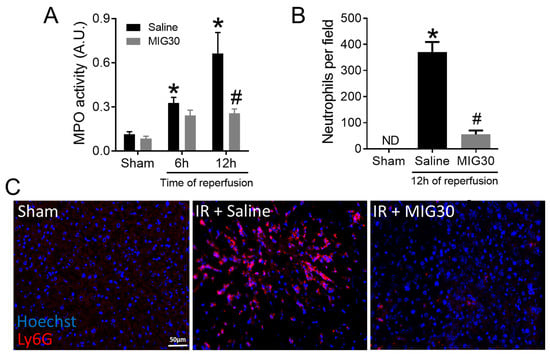 MIG30 treatment impairs neutrophil recruitment during liver IRI. (A) Liver MPO activity in mice subjected to liver ischemia-reperfusion injury (IRI). Sham operated mice were used as control. IRI mice were treated i.v. with saline vehicle or with MIG30 (100 µg 15 min before the reperfusion and again 6 h later). (B,C) Immunostaining of liver cryosections with anti-Ly6G to show recruited neutrophils. Neutrophils (Ly6G+) are shown in red and Hoechst-stained nuclei in blue. (B) The data shown are the averaged number of neutrophils per field of view. (C) Representative photomicrographs of Ly6G+ neutrophils in sham, mice subjected to IR and treated with saline or IR-injured mice treated with MIG30. ND = Not detected. The data shown are the mean ± SEM; n is at least 4 mice per group. * p < 0.05 vs. sham group; # p < 0.05 vs. saline-treated mice. Scale bar = 50 µm.