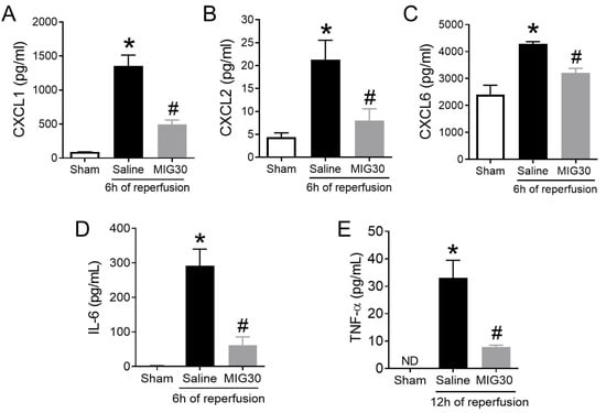 The levels of CXC chemokines and proinflammatory cytokines are reduced in MIG30-treated mice. Quantification of (A) CXCL1, (B) CXCL2, (C) CXCL6, (D) IL-6 and (E) TNF-α in the sera of mice subjected to liver IRI. Sham operated mice were used as control. IRI mice were either treated with saline vehicle or with MIG30 peptide (100 µg 15 min before the reperfusion and again 6 h later, i.v.). CXCL1, CXCL2, CXCL6 and IL-6 were measured at 6 h of reperfusion. TNF-α was measured 12 h post reperfusion. ND = Not detected. The data shown are the mean ± SEM; n is at least 4 mice per group. * p < 0.05 vs. sham group; # p < 0.05 vs. saline-treated mice.