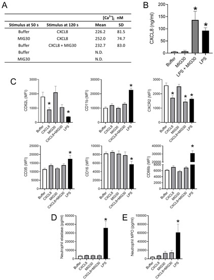 For the production of CXCL8 in vitro, PBMCs were stimulated for 24 h with 100 ng/mL LPS (Sigma-Aldrich) and/or 4 µg/mL (1 µM) MIG30. The CXCL8 concentration was measured in the supernatants by ELISA. In a 96 well-plate (Corning), 250 ng/mL of the monoclonal anti-human CXCL8 capture antibody (MAB208, R&D systems) was incubated overnight at 4 °C. Plates were blocked with PBS with 0.1% casein and 0.05% Tween 20 for 1 h at 37 °C. Detection was performed with 250 ng/mL biotinylated polyclonal goat anti-human CXCL8 antibody (BAF208, R&D Systems) for 1 h at 37 °C. The incubation of peroxidase-conjugated streptavidin for 30 min at 37 °C allowed the oxidation of TMB substrate in the presence of H2O2, after which the reaction was stopped by adding 1 M H2SO4. Absorbance was measured at 450 nm using a PowerWave XS plate reader (BioTek Instruments, Aschaffenburg, Germany) and compared to a standard curve of recombinant CXCL8 (Peprotech). For the release of elastase and MPO, 2 × 106 neutrophils were seeded in a 6-well plate in RPMI-1640 medium containing 10% FCS and GM-CSF (5 ng/mL). Cells were stimulated for 1 h at 37 °C with LPS (5 µg/mL), CXCL8 (10 ng/mL), MIG30 (20 µg/mL) or a combination of CXCL8 and MIG30. After 1 h, the cells were spun down (10 min, 240× g) and analyzed for marker/receptor expression (vide supra). Release of elastase and MPO in the supernatants was determined by commercially available Duoset ELISAs (R&D Systems; catalog numbers DY9167 and DY3174), according to the manufacturer’s instructions.