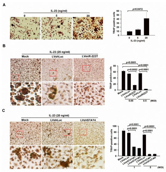According to our previous study, miR-223 was shown to play a key role in promoting osteoclastogenesis during the progression of CIA and might serve as a therapeutic target in RA []. At present, our results implied that IL-23 was an upstream regulator of miR-223 and responsible for the pathogenesis of CIA. Therefore, we anticipated that the IL-23 signaling might induce osteoclastogenesis through miR-223. Indeed, IL-23 dose-dependently increased the number of tartrate-resistant acid phosphatase (TRAP)-positive cells in BMMs from DBA/1 mice (Figure 2A). To correlate IL-23 signaling with miR-223 in osteoclastogenesis, we silenced miR-223 and STAT4 in IL-23-treated BMMs by lentiviral gene delivery of miR-223 target sequences (LVmiR-223T) [] and shRNA specific to STAT4 (LVshSTAT4#1 and LVshSTAT4#2) and observed lower numbers of TRAP-positive cells than those in control cells (Figure 2B,C).