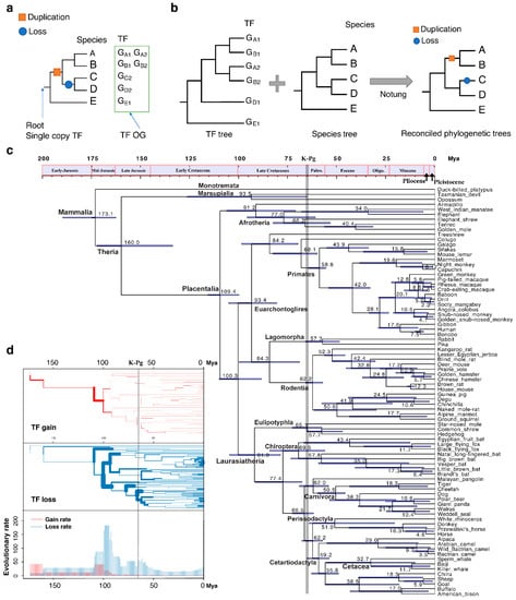 So far, the exact mechanism of TFs, which work during the fast adaptation of mammals to changing environments via macroevolution, is poorly understood. Advances in comparative genomics have clearly shown that the exclusive use of genes as evolutionary units is an oversimplification of real evolutionary relationships [,]. Orthologous groups (OGs) refer to sets of genes that have descended from a single ancestral gene in a given ancestral species or taxonomic level. In this research, we use orthologous groups of TFs on the mammal level, rather than TF families to category TFs and construct phylogenetic trees. The OG category approach maintains the evolutionary events in mammalian history and avoids the difficulty of constructing trees for large TF families such as C2H2. By reconciling OG trees of TFs to mammal species tree, the gain and loss events of TFs can be detected. However, for trait values, only current species are available and certain. Here, we use the presence and absence of TFs on terminal branches to detect the possible association with trait divergence. In this study, we show the pattern of TF loss and address the role of TFs in the macroevolutionary process of mammals by describing the correlation between TF loss, target gene (TG) and molecular evolutionary rate, and also between TF loss and species traits.