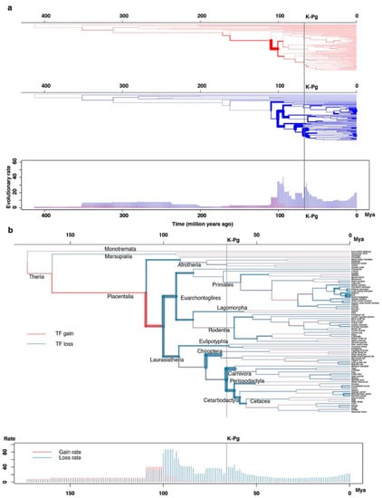 Between 100 and 95 Mya, mammals, especially placental mammals underwent initial diversification, the average TF loss rate reached its first peak of 182.4/My (Figure 1c,d). The second peak of TF loss occurred near the Cretaceous–Paleogene (K–Pg) boundary, at 66 Mya. The TF loss rate was as high as 64.5/My within a 4-Mya window of the K–Pg boundary.