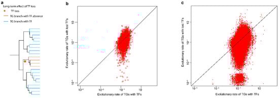 To quantify the effect of TF loss on transcription factor’s target genes (TF-TGs), we examined TG evolutionary rates based on 9396 TF-TG interactions by literature curations from the TTRUST2 database [], and 1,342,129 TF-TG interactions based on Chip-seq data from the hTFtarget database [] (Figure 5). Figure 5b,c, which compare the evolutionary rates of 1-to-1 orthologous TGs with TFs and the evolutionary rates of TGs without TFs, clearly show the decelerating effect of TF loss on TGs over the long term (paired t-test, p-value = 0.017 for TF-TG interactions by literature curations; p-value < for TF-TG interactions based on Chip-seq data). If it is the decelerate evolutionary rate of TG which drives the TF loss, we will see many low-rate TGs with TFs, or many points on the left side of Figure 5b,c, but they do not show this pattern. Because the rate of molecular evolution of a gene is negatively correlated with the strength of a functional constraint [], the decelerated gene tends to be conserved. As the target genes covers more than fifteen thousand genes, it suggests that currently surviving genes have been “protected” by TF loss over a long time period, especially during macroevolution.