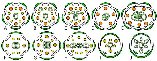 - Remizowa, M.V. One upward, two steps down: Order of floral organ initiation. Russ. J. Dev. Biol. 2019, 50, 325–340. [Google Scholar] [CrossRef]