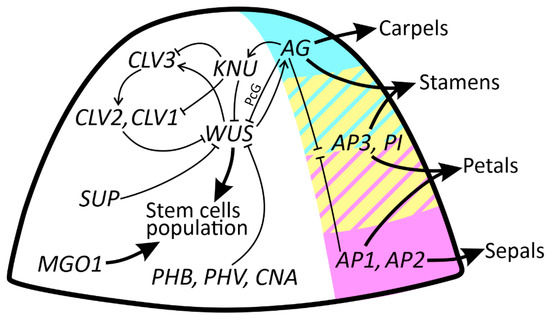 There are two known regulatory pathways governing FM size and proliferation in Arabidopsis. One of them includes WUS and CLV, and the other involves AG and WUS. WUS and CLV3 form a negative feedback loop that promotes cell–cell communication between the CZ and the RM to maintain the appropriate SAM volume. The CLV3 signal inhibits WUS expression and restricts the WUS transcript to the OC, whereas WUS positively regulates the expression of CLV3 in the CZ [31]. After the initiation of carpels, the floral meristem ceases to maintain a stem cell population (called determinacy). The CLV/WUS pathway components are implicated in the development of multilocular fruit trait in cultivated mustard varieties (Brassica); some examples will be provided in the last section.