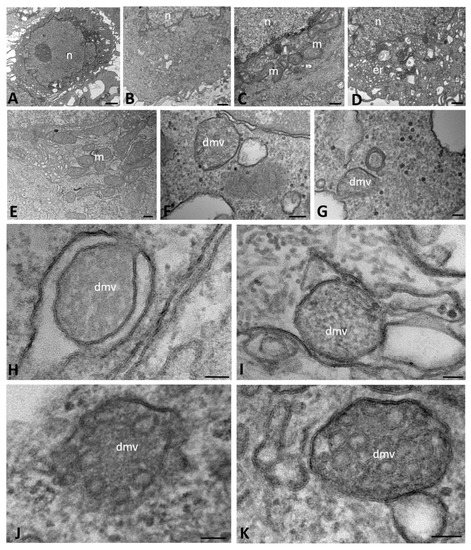 We also studied CFBE41o- WT cells infected with SARS-CoV-2. At early stages (1–6 h post infection (hpi)), the Golgi apparatus, ER and perinuclear cisternae appeared moderately dilated and with electron-dense contents. The cytoplasm contained irregularly shaped mitochondria and numerous polyribosomes that were distributed on the surface of the cisternae (Figure 1E). Homogeneous and electron-dense secretory granules were found scattered in the cytoplasm; we considered these to be proteinaceous in nature (Figure 1F,G). In apposition to the nuclear membrane, several profiles of DMVs were visible (Figure 1F); these structures were not observed in mock-infected cells. The DMVs were approximately 100–300 nm in diameter, usually had a rounded or oval shape and sometimes appeared completely enveloped by a double membrane, although the membrane was apparently interrupted in some tracts (Figure 1G,H). The outer and inner DMV membranes were tightly packed and in continuity with the ER membranes or the surrounding structures (Figure 1H,I). Their contents were of a homogeneously diffuse and granular matrix with an electron density similar to that of the cytoplasm. Nonetheless, during the course of infection, different profiles of DMVs were identified based on their content: some appeared to be filled with a granular dense matrix, as described above, while others contained vesicles that were externally surrounded by a coating and embedded in the matrix (Figure 1J,K). The vesicular profiles were relatively homogeneous in size and, thus, considered to be viral particles assembling.