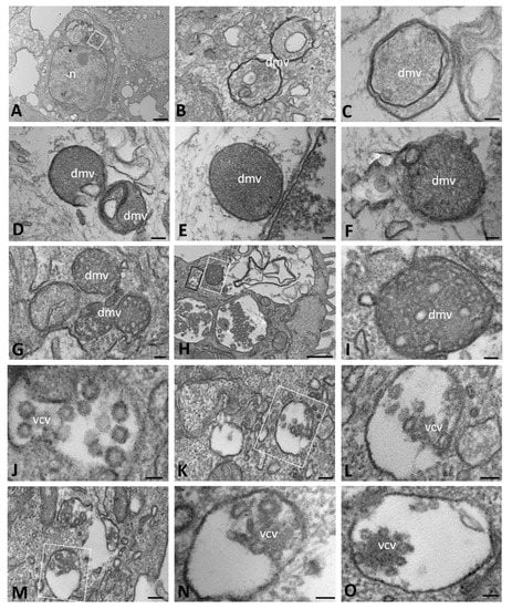 Moreover, from 48 hpi onward, the peripheral cytoplasm of many WT cells contained electron-dense and double-membrane-bound structures, which appeared to be autophagosomes; these were always observed in cells in which the replicative structures previously described were clearly recognizable (Figure 3A–G). The autophagosomes were large and highly irregular in shape, ranging from 480 to 1600 nm in size, and were especially evident at the latest time point of analysis (72 hpi). Their content was polymorphic in appearance, mainly consisting of vesicular structures and resembling the DMVs with granular content observed at early times post infection (Figure 3D,G–J); some also contained viral particles with well-evident nucleocapsids (Figure 3D,K–M).