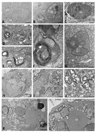 At early time points of infection, in contrast to the observations in WT cells, autophagosomes with an irregular shape were highlighted throughout the cytoplasm of ΔF cells. These autophagosomes contained cytoplasmic structures, such as poorly preserved mitochondria and lipid droplets, as well as an electron-dense structureless content (Figure 6A–C). At late time points of infection, these autophagosome structures were still present and showed a cytoplasmic matrix content (Figure 6D). However, autophagosomes showing ER membranes concentrically arranged or vesicles with a highly electron-dense content were observed mainly at 72 hpi (Figure 6E–G).