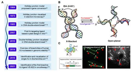 History, structure, and visualization of HJ. (A) Representative studies of HJ from 1964 to 2021. [2,3,9,10,11,17,18,19,20] (B) Schematic of two major HJ configurations termed “X-stacked” and “open-planar”, the X-stacked conformation usually exists in the condition of high concentration counter-ion (Mg2+) or certain ligand, and this conformation can be converted to the “open-planar” under the process of HJ nucleases [12]. (C) The visualization of HJ via an engineered RuvC protein (blue triangles), which defects nuclease activity and selectively targets HJ (left). The fluorescent foci represent the exogenous plasmid HJ (middle) and spontaneous HJ in E. coli (right) [19].
