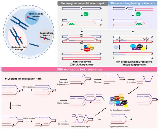 There are many types of DNA damage, and the damage frequently occurs in various biological processes under the pressure of environments or chemical molecules (Figure 2) [37]. Every human cell suffers from serious DSB damage more than 50 times in response to replication arrest and telomere collapse throughout life [38,39]. However, this damage can be precisely repaired following the procedure of a recombination-mediated pathway between the undamaged sister chromatid, and sometimes between the homologous chromosomes. In these cases, intermediate HJs are produced and resolved step-by-step to generate proper repair products.