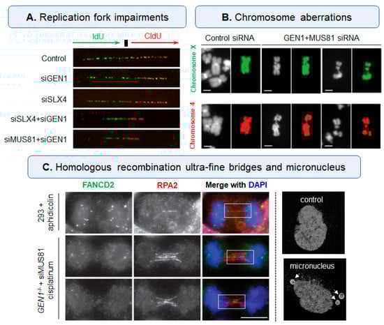 Typical damage caused by unsolved-HJ in nucleases-deficient cells. (A) Combined depletion of SLX4-GEN1 or MUS81-GEN1 slowed the progression of replication fork using DNA fiber assay, fibers were stained with IdU (green) and CldU (red) antibodies to represent the replication fork progress. (B) Combined depletion of MUS81-GEN1 in BS patient cells induced serious chromosome breakages (sained with DAPI in chromosomes X and 4). (C) Combined depletion of MUS81-GEN1 increased homologous recombination ultra-fine bridges (HR-UFBs) in cisplatinum-treated cells compared with normal 293 cells treated with aphidicolin (HR-UFBs were stained with RPA2 and FANCD2), and HJ-ligand induced micronucleus in cancer cells [20,82,84,86].