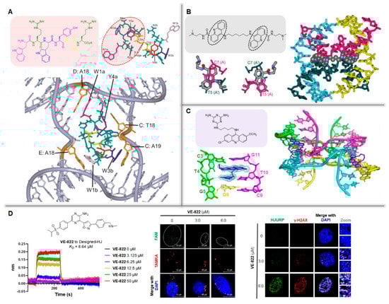 In addition, the bioactive molecule VE-822 was screened from a small DNA damage agent library and identified as a novel HJ ligand in recent research. In interaction study shown in Figure 4D (left), the binding curve closely reached saturation with the increasing concentration of compound, and the disassociation constant (KD) value of VE-822 to HJ was determined as 8.64 μM [20]. Furthermore, the effect of VE-822 on HJ assembly was detected using fluorescence quenching assay. In this assay, two adjacent sub-chains of HJ were labeled with fluorophore carboxylfluorescein (FAM, green) and quencher tetramethylrhodamine (TAMRA, red), respectively, and the fluorescence of FAM was significantly decreased, indicating VE-822 could promote the assembly of transfected DNA-HJ in cells (Figure 4D, middle). Cell biological evaluations suggest that VE-822 can inhibit HR-based repair to induce extensive DNA damage in osteosarcoma U2OS cells, and this damage can be restored by overexpressing the HJ-dissolution enzyme BLM. Most importantly, increasing colocalization foci of γ-H2AX and the Holliday Junction Recognition Protein (HJURP) are observed in a dose-dependent manner, suggesting that the damage induced by VE-822 is closely linked with the stabilized HJs (Figure 4D, right). A subsequent cell signaling study reveals that the damage caused by VE-822 is blocked in DNA-PKCS-silenced cells (via DNA-PKCSi Nu7026 and RNAi), indicating that the activation of DNA-PKCS may be an important sensor in response to HJ-stabilized damage. In oncotherapy, VE-822 exhibits a synergistic effect with the DNA damaging agent doxorubicin as well as the hexapeptide WRWYCR mentioned above, and a low concentration of VE-822 obviously enhances the antitumor effect of doxorubicin in tumor cells, which can be mitigated by the overexpressed BLM. Taken together, HJ has considerable promise as a sensitizing target in anticancer therapy.