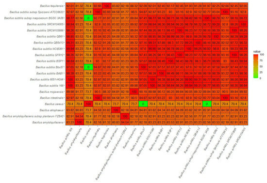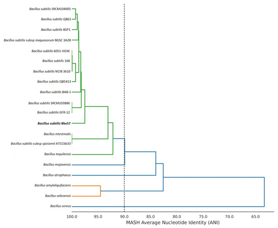 The short reads of Bbv57 were processed using CLC Genomics workbench v 21.0.3 (CLC bio, Aarhus, Midtjylland, Denmark). The filtered reads were searched against the 16S ribosomal RNA sequences database using the Blastn program using default parameters. The average nucleotide identity (ANI) between Bacillus subtilis Bbv57 and 19 other Bacillus strains in the database was calculated using the ANI calculator [44]. An ANI-based phylogenetic tree of 20 different Bacillus strains was constructed with MASH clustering [45]. A pangenome analysis of 20 different Bacillus strains was carried out to analyze the gene differences using the Roary matrix [46].