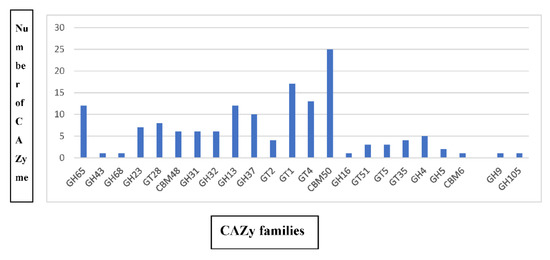 CAZymes are a group of enzymes possessing key roles in carbohydrate metabolism [19], and information on CAZymes is stored in the CAZy database (www.cazy.org, accessed on 16 July 2022). CAZymes are grouped into five different classes, viz., glycoside hydrolases (GHs), glycosyltransferases (GTs), polysaccharide lyases (LPs), carbohydrate esterases (CEs), and auxiliary activities (AAs). A bioinformatic analysis of the Bbv57 genome sequence information identified 65 glycoside hydrolases (GHs), 53 glycosyltransferases (GTs), and 32 carbohydrate-binding modules (CBMs) belonging to the group of CAZymes (Figure 3). Bacillus subtilis Bbv57 was found to harbor potential antifungal CAZymes, viz., endo β1,4 glucanase (GH 5), chitinase (GH18), endoglucanase (GH51), and xyloglucanase (GH16), which have the potential to inhibit the growth of plant pathogens. The distribution of CAZymes in the Bacillus subtilis Bbv57 suggests that it poses a secondary metabolic potential for this strain.