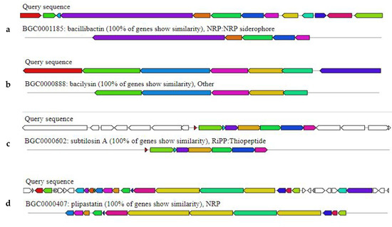 The Bbv57 genome was found to harbor genes encoding for novel secondary metabolites having antimicrobial properties. Three gene clusters encoding NRPS (non-ribosomal peptide synthetase), two gene clusters encoding for terpene biosynthesis, one gene cluster for T3PKS (Type III polyketide synthetase), one cluster for CDPS (Cyclodipeptides synthetase), one cluster for sactipeptide biosynthesis, and one gene cluster encoding for bacilysin biosynthesis were all identified in the Bbv57 genome. Among the three gene clusters encoding for NRPS, one cluster was found to exhibit 100% similarity with genes involved in fengycin and piplastin synthesis, another cluster showed 100% similarity with gene clusters involved in bacillibactin and paenibactin synthesis, and the third cluster was found to exhibit 82% similarity with genes involved in the biosynthesis of surfactin. The gene cluster encoding for sactipeptide synthesis showed 100% similarity with subtilosin A (Figure 4).