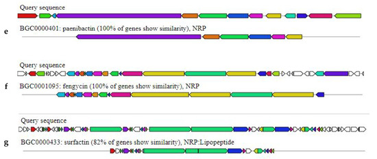 Secondary metabolites’ gene clusters with antimicrobial metabolites in Bacillus subtilis Bbv57, identified by antiSMASH 6.0 (a) Bacillibactin, (b) bacilysin, (c) subtilosin A, (d) fengycin, (e) piplastin, (f) paenibactin, and (g) surfactin.