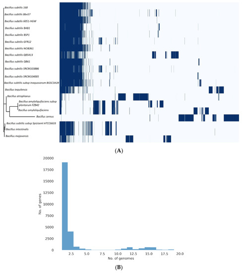 Bacillus subtilis pangenome. The pangenomes of six Bacillus sp. were determined using the Roary matrix. A total of 28,404 sets of orthologous proteins were found. (A) A heatmap showing the gene presence (dark blue) or absence (light blue) in each of the 20 strains. A phylogeny built based on the core genes is shown on the left, and the species names are indicated on the right. (B) A histogram displaying the distribution of genomes per gene is found within.