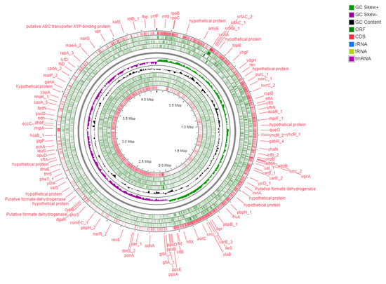 The obtained raw reads were filtered using FastQC version 0.11.9 [35] and sickle version 1.33 [36]. The high-quality adapter-free filtered reads were assembled using SPAdes version 3.9.0 [37] and polished by pilon [38]. The polished sequences were used for reference to guide the scaffolding with Bacillus subtilis subsp subtilis str 168 (AL009126.3) by ragtag [39]. The gene prediction was performed using Prodigal version 2.6 [40] and annotated using Prokka version 1.12 [41]. A circular map of the strain Bbv57 genome was constructed using a CG viewer [42] (Figure 7). The genes were mapped onto pathways against the Kyoto Encyclopedia of Genes and Genomes (KEGG), the Clusters of Orthologous Groups (COG) classification, and the Gene Ontology (GO) database using OmicsBox 2.0.10 [43].