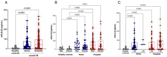 We quantified the plasma levels of sHLA-G (ng/mL) in the peripheral blood of the healthy control (n = 50) and home (n = 60) and hospital (n = 129) care groups with COVID-19. Compared with healthy controls, COVID-19 patients (whole group or stratified into undergoing home or hospital care) exhibited increased sHLA-G levels (p < 0.0001, for each comparison). The comparison of sHLA-G levels between the COVID-19 groups (home and hospital) revealed no significant difference. sHLA-G levels continued to be increased when compared with controls even after the stratification of patients according to age and gender, except for home care patients who represented a very small group, encompassing only three patients. No significant differences were observed between patients (home or patient care) after stratification by age and gender (Figure 1).