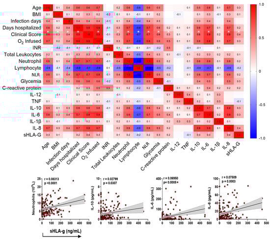 Then, we performed a Spearman correlation test matrix between the plasma levels of sHLA-G with the variables age, BMI, days of infection and days of hospitalization, clinical score, infused O2 concentration, international normalized ratio (INR), total leukocytes, neutrophils, lymphocytes, neutrophil–lymphocyte Ratio (NLR), glycemia, C-reactive protein (CRP), and the cytokines IL-12, TNF, IL-10, IL-6, IL-1β, and IL-8. To interpret the magnitude of correlations, the classification of correlation coefficients was adopted as follows: <0.4 (weak correlation), >0.4 to <0.5 (moderate), and > 0.5 (strong), as detailed in Supplementary Table S2 [23].