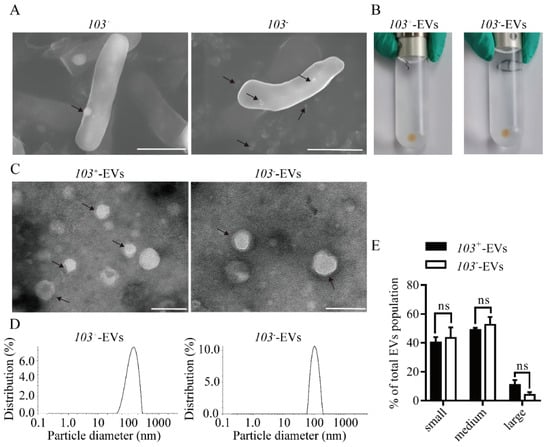 Characterization of extracellular vesicles (EVs) isolated from strains of R. equi 103+ (103+) and R. equi 103− (103−). (A) Scanning electron microscopy visualization of EVs production by strains of 103+ or 103−. Black arrow indicates EVs. Scale bars 1 um. (B) EVs pellet by ultracentrifugation from strains 103+ (103+-EVs) or 103− (103−-EVs). (C) 103+-EVs or 103−-EVs were visualized by negative staining transmission electron microscopy. Black arrow indicates EVs. Scale bars 100 nm. (D) Dynamic light scattering determination of size distribution for 103+-EVs or 103−-EVs, respectively. (E) Quantification by dynamic light scattering of the size distribution of small (<100 nm), medium (100–200 nm) and large (>200 nm) EVs produced by strains of 103+ or 103−, as indicated. The comparisons between groups were performed by one-way ANOVA followed by Tukey’s test. ns, not significant.