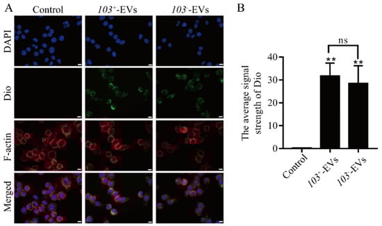 The 103+-EVs or 103−-EVs were stained with Dio (10 μM; Beyotime Biotechnology, Shanghai, China) for 20 min. The Dio-labeled 103+-EVs or 103−-EVs were centrifuged at 150,000× g for 3 h and washed in PBS. J774A.1 cells were plated onto a covered with sterile coverslips. Dio-labeled 103+-EVs or 103−-EVs were incubated with J774A.1 cells. The macrophages were fixed using 4% paraformaldehyde for 10 min. The macrophages were washed in PBS, and the nuclei were labeled with 4′,6-diamidino-2-phenylindole (Beyotime Biotechnology, Shanghai, China). A glass cover was added to the slide with neutral resin. Cells were stained with Rhodamine-labeled F-actin (Beyotime Biotechnology, Shanghai, China). The slides were visualized using a confocal microscope.