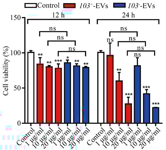Cell counting kit-8 assays were performed on J774A.1 cells in order to investigate the cytotoxic potential of R. equi-EVs in macrophage. J774A.1 cells were challenged at 12 h and 24 h with 103+-EVs or 103−-EVs in a dose-dependent manner. We verified that J774A.1 cells exposed to 103+-EVs or 103−-EVs within 12 h or 24 h showed decreased viability compared to the PBS-treated cells (Control). 103+-EVs or 103−-EVs concentrations between 1 μg/mL to 20 μg/mL significantly reduced the viability of macrophages in a dose-dependent manner over time. Furthermore, the viability of J774A.1 cells did not differ significantly between the 103+-EVs and 103−-EVs groups (Figure 3).