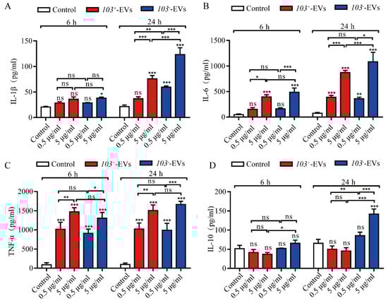 To evaluate the capacity of R. equi-EVs induced proinflammatory response, we analyzed the expression of inflammatory cytokine factor interleukin-1β (IL-1β), interleukin-6 (IL-6), tumor necrosis factor α (TNF-α), and interleukin-10 (IL-10) in J774A.1 cells with adding an increased dose of 103+-EVs or 103−-EVs (0.5 μg/mL and 5 μg/mL according to the protein concentration) for 6 and 24 h. The results showed that IL-1β, IL-6 and TNF-α were significantly increased in J774A.1 cells treated with 103+-EVs and 103−-EVs in a time- and dose-dependent manner (Figure 4A–C). The 103+-EVs treatment did not stimulate the level of IL-10 at 6 h nor 24 h (Figure 4D). However, the expression of IL-10 was increased in J774A.1 cells with treatment of 103−-EVs (5 μg/mL) at 24 h (Figure 4D). The observation suggested that both 103+-EVs and 103−-EVs could induce macrophage inflammatory, and 103−-EVs might induce a higher inflammatory response in macrophages than 103+-EVs.