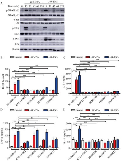 The 103+-EVs and 103−-EVs induced inflammatory cytokines secretion was regulated by NF-κB, and MAPK signaling pathways. (A) 103+-EVs and 103−-EVs induced the phosphorylation of NF-κB p65, p38, ERK and JNK protein in J774A.1 cells. J774A.1 cells were co-incubated with 103+-EVs or 103−-EVs at concentrations of 5 μg/mL for 0 min (control), 15 min, 30 min, 45 min, 60 min, and 120 min, the phosphorylated and total protein of NF-κB p65, p38, ERK and JNK were detected by western blotting. The concentrations of (B) IL-1β, (C) IL-6, (D) TNF-α, and (E) IL-10 in the culture supernatants. The inhibitors of NF-κB (BAY-117082, 10 μM), p38 (SB203580, 10 μM), ERK (PD98059, 20 μM), and JNK (SP600125, 20 μM) were used to pretreat for 2 h before stimulation J774A.1 cells with 103+-EVs or 103−-EVs at concentrations of 5 μg/mL for 24 h, and then collected supernatants. The data were compared with the no inhibitor stimulated control cells. The comparisons between groups were performed by one-way ANOVA followed by Tukey’s test. * p < 0.05, *** p < 0.001, and ns, not significant.