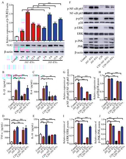 103+-EVs and 103−-EVs induced cytokines secretion was regulated by TLR2 signaling pathway. (A) J774A.1 cells were co-incubated with 103+-EVs or 103−-EVs at concentrations of 5 μg/mL for 3 h, 6 h, 12 h, and 24 h, the protein of TLR2 was detected by western blotting. The results of western blotting were analyzed by gray scale. Inhibitors of TLR2 (C29, 100 μM) was used to pretreat for 1 h before stimulation J774A.1 cells with 103+-EVs or 103−-EVs at concentrations of 5 μg/mL for 24 h, and then detected the protein levels of (B) IL-1β, (C) IL-6, (D) TNF-α, and (E) IL-10 in the culture supernatants by ELISA. (F) Inhibitors of TLR2 (C29, 100μM) was used to pretreat for 1 h before stimulation J774A.1 cells with 103+-EVs or 103−-EVs at concentrations of 5 μg/mL for 15 min, and then detected the phosphorylation of NF-κB p65, p38, ERK and JNK protein by western blotting. The results of western blotting were analyzed by gray scale. Relative gray value shows the ratio of (G) Phospho-NF-κB p65 (p-NF-κB p65) to total NF-κB p65 protein, (H) Phospho-p38 (p38) to total p38 protein, (I) Phospho-ERK (p-ERK) to total ERK protein, and (J) Phospho-JNK (p-JNK) to total JNK protein. The data were compared with the control cells. The comparisons between groups were performed by one-way ANOVA followed by Tukey’s test. * p < 0.05, ** p < 0.01, *** p < 0.001, and ns, not significant.
