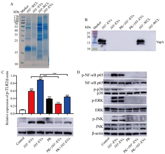 The reduced content of 103+-EVs and 103−-EVs proteins decreased the inflammatory effects induced by 103+-EVs or 103−-EVs. (A) SDS-PAGE analysis of the 103+-EVs and 103−-EVs proteins. WCL: whole bacteria cell lyste. (B) Western blotting analysis of the exist of virulence associated protein A in 103+-EVs and 103−-EVs. PK: proteinase K-treated. (C,D) J774A.1 cells were treated with native 103+-EVs or native 103−-EVs (5 μg/mL), proteinase K-treated 103+-EVs or 103−-EVs (5 μg/mL before proteinase K treatment) for different times, respectively, and then detected the (C) TLR2 protein, (D) phosphorylation of NF-κB p65, p38, ERK and JNK protein by western blotting. The concentrations of (E) IL-1β, (F) IL-6, (G) TNF-α, and (H) IL-10 in supernatants from J774A.1 cells. J774A.1 cells were treated with native 103+-EVs or native 103−-EVs (5 μg/mL), proteinase K-treated (PK) 103+-EVs or 103−-EVs (5 μg/mL before proteinase K treatment) for 24 h, respectively, and then collected the supernatants. The concentrations of inflammatory factor measured by ELISA. The data were compared with the control cells. The comparisons between groups were performed by one-way ANOVA followed by Tukey’s test. * p < 0.05, ** p < 0.01, *** p < 0.001, and ns, not significant.