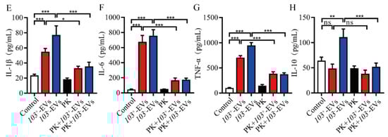 The 103+-EVs and 103−-EVs activate inflammatory responses in J774A.1 cells. The concentrations of (A) IL-1β, (B) IL-6, (C) TNF-α, and (D) IL-10 in supernatants from J774A.1 cells. The supernatants from the J774A.1 cells stimulated with various concentrations of 103+-EVs or 103−-EVs for 6 h or 24 h were collected, and the inflammatory cytokines levels were measured by ELISA. The data were compared with the PBS stimulated control cells. The comparisons between groups were performed by one-way ANOVA followed by Tukey’s test. * p < 0.05, ** p < 0.01, *** p < 0.001, and ns, not significant.