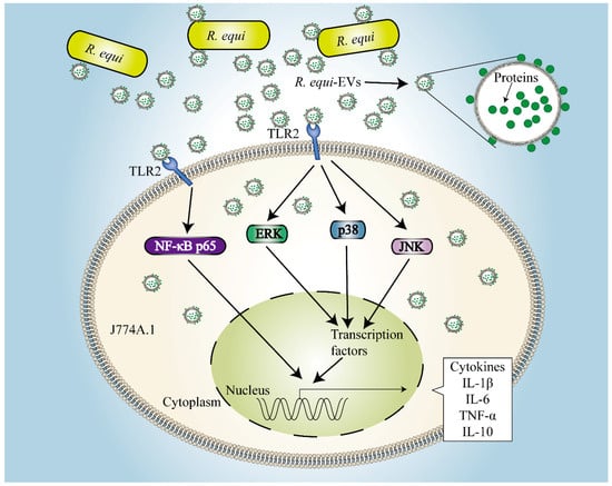 The model of R. equi-derived extracellular vesicles (R. equi-EVs) promoting inflammatory response in macrophage through TLR2-NF-κB/MAPK pathways.