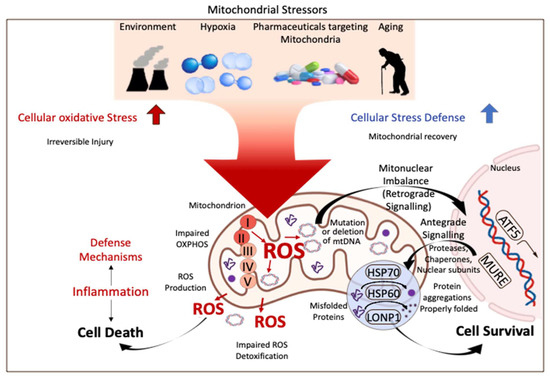 Mitochondrial stress response and signaling in injury and disease. Mitochondria are key compounds in all cells and balance injury with resilience to defend cells from stress induced by the environment, related to ageing, or from hypoxia. Mitochondria are therefore crucial for cells and organs to survive the process of donation, preservation, and transplantation. ROS: reactive oxygen species; ATF 5: activating transcription factor; HSP 60/70: heparan sulfate 60/70; LONP1: Lon peptidase 1. This figure was designed with the support from biorender.com (accessed on 15 June 2022).