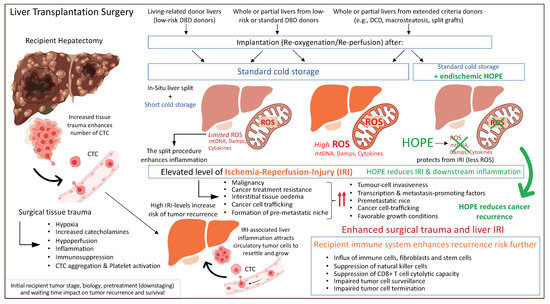 Mitochondria were identified as key contributors, which trigger overall tissue inflammation and thereby create an attractive environment for CTCs to resettle and grow. The ROS–Damps–cytokine cascade instigates further downstream effects in the liver micro-environment, enabling CTC migration through the SEC barrier. This cascade is of high relevance in transplantation with higher donor and recipient risk and in the context of the additional risk factors described before.
