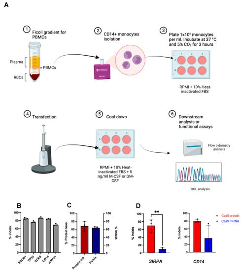 CRISPR-Cas9 mediates genome editing in primary human monocytes. (A) Schematic depicting monocyte editing workflow. Monocytes are isolated from PBMCs of healthy human donors and then electroporated with GFP mRNA or Cas9 and sgRNA targeting gene of interest. Electroporated cells are then analyzed for gene editing and protein loss. (B) Percent indel formation of gene targeted for CRISPR-Cas9 RNP editing as measured by TIDE. (C) Bar graphs showing levels of protein loss (left bar) and indel formation (right bar) (p = 0.6735) post Cas9 RNP targeted SIRPa KO. (D) Bar graph depicting the level of indel formation at SIRPA and CD14 after treatment with Cas9 RNP or Cas9 mRNA and either SIPRA or CD14 sgRNA (n = 3 independent biological donors) (** p < 0.01). Statistical analyses were conducted using unpaired Welch’s t test.