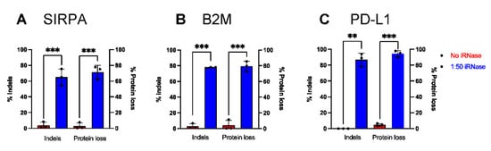 iRNase enhanced Cas9 mRNA mediates various gene KO in monocytes. Percent of monocytes with indels, as measured by TIDE analysis, or loss of protein expression, as measured by flow cytometer following electroporation with Cas9 and gRNAs targeting either (A) SIRPA (B) B2M and (C) PD-L1 in the presence (Blue) or absence of iRNase (Red). Statistical analyses were performed using Student’s t-test (n = 3 independent biological donors) (** p < 0.01, *** p < 0.001).