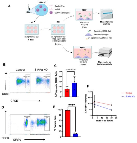 Finally, we examined whether primary human monocytes can be genetically modified to increase anti-cancer activity. Previous work by Weissman and colleagues reported that antibody blockade of SIRPα/CD47 interaction in conjunction with rituximab (anti-CD20) allows for enhanced antibody-dependent cellular phagocytosis (ADCP) and antibody-dependent cellular cytotoxicity (ADCC) of macrophages [,,]. Therefore, we tested whether CRISPR-Cas9 mediated SIRPA gene knockout in monocytes can enhance ADCP and ADCC against a rituximab-opsonized CD47-expressing cancer cell line, i.e., Raji cells (Figure 7A). This approach has the potential to be superior to the use of blocking antibodies due to reduced systemic toxicity as the gene edits are autonomous to the engineered monocytes. To this end, monocytes were transfected with CRISPR-Cas9 targeting the SIRPA locus, rested for 3 days in a low cytokine media to allow editing to occur, and then further differentiated into M1 macrophage (M1 MDMs) and assessed by flow cytometry to confirm SIRPα protein loss. Interestingly, this revealed that SIRPα protein was highly reduced in knockout samples but not completely abolished when compared to an isotype control (Supplementary Figure S9), indicating significant retention of SIRPα protein on the surface membrane of MDMs, potentially as a result of slow turnover of SIRPα post-genetic knockout. The SIRPα knockout M1 macrophages were then subjected to ADCP assays with CFSE-labeled Raji target cells, a cancer cell line derived from a Burkitt lymphoma and expressing CD47 and CD20 on their surface. SIRPα knockout MDMs were co-cultured with rituximab-opsonized-CFSE Raji cells at 1:4 of E:T ratio for 4 h and flow cytometry was used to measure the frequency of phagocytic MDMs. We observed a trend of increasing phagocytic activity in the SIRPα knockout MDMs when compared to wild-type MDMs (13% and 8%, respectively), though it was not statistically significant (Figure 7B,C) despite having a high frequency of SIRPα knockout (Figure 7D,E).