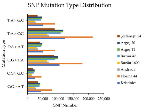 The distribution of the six types of SNP mutations is displayed in Figure 1. The highest number of SNPs was observed in the genotype Florina 44 for all six SNP types, and the lowest number was observed for the genotype Buzău 1600. Among the six types of SNP mutations, for all genotypes, the highest number of SNPs was the T:A > C:G type, followed by C:G > T:A, whereas the lowest number of SNPs was the C:G > G:C type.