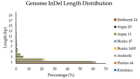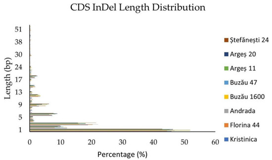 A total of 622,988 InDels were identified within the studied genotypes, ranging from 66,768 in Buzău 1600 to 110,138 in Florina 44. For all genotypes, the total number of insertions was roughly double the total number of deletions. The highest number of InDels was detected in the intergenic regions for all genotypes (between 47,309 in Buzău 1600 and 82,716 in Florina 44), followed by the intronic (between 8360 in Buzău 1600 and 12,236 in Florina 44), upstream (between 4584 in Argeș 20 and 6341 in Florina 44), downstream (between 2915 in Buzău 47 and 4157 in Florina 44), upstream/downstream (between 357 in Buzău 47 and 578 in Florina 44), exonic (between 338 in Buzău 1600 and Buzău 47 and 493 in Florina 44), and splicing regions (between 32 in Buzău 47 and 52 in Florina 44). For the exonic InDels, for all genotypes, the number of frameshift InDels were higher than the non-frameshift ones. The highest number of frameshift deletions was detected in the Florina 44 genotype (163), and the lowest number in the genotype Buzău 1600 (115), and for the frameshift insertions the highest number was observed in genotype Ștefănești 24 (129) and the lowest number in the genotype Buzău 47 (102). As for the non-frameshift InDels, the highest number of deletions was detected in the genotype Ștefănești 24 (101) and the lowest number in the genotype Buzău 47 (47).